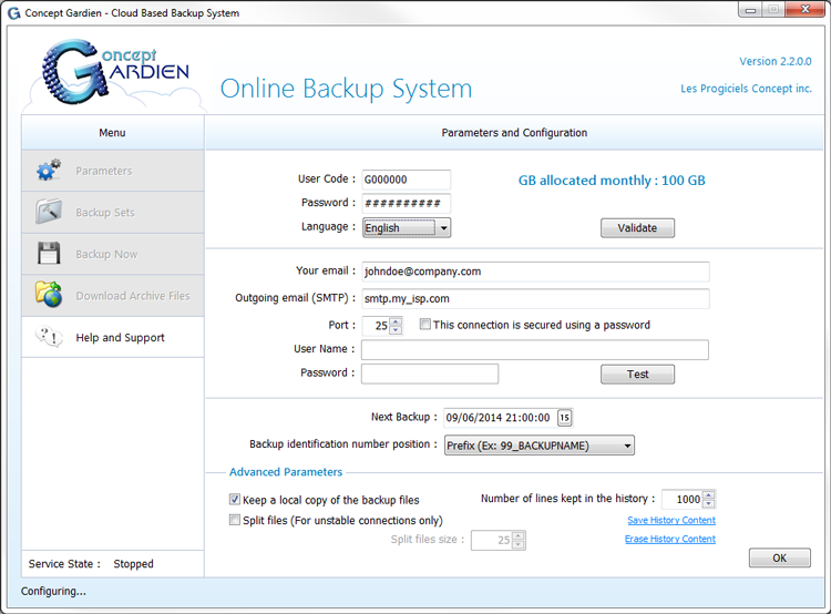 To activate Concept Gardien, it is necessary to enter the User Code and Password that were given to you when you purchased the program. You must enter this information in the fields provided for this purpose and click Validate. A message indicates whether the entered parameters are valid or not. In addition, the number of GB (gigabytes) allocated monthly for your backups is displayed.