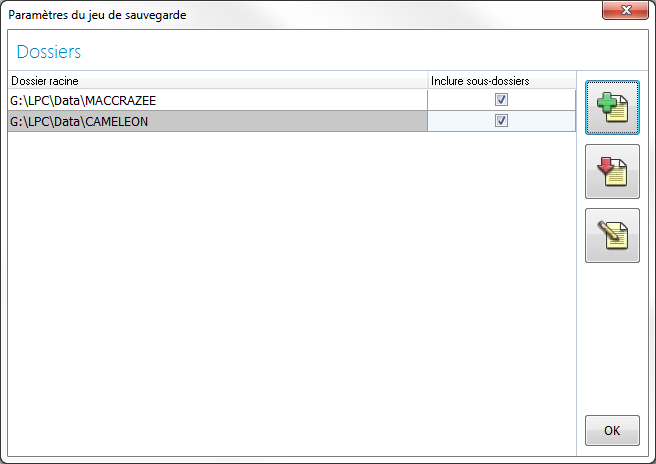 Le bouton permet de retirer un dossier existant au jeu de sauvegarde. Pour corriger un dossier existant, cliquer le bouton ou double-cliquer la ligne correspondante dans la liste.