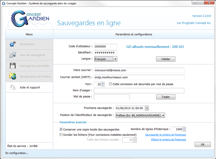 Pour activer Concept Gardien, il est nécessaire d'inscrire le code d'utilisateur et l'identifiant qui ont été livrés à l'achat du programme. Il faut entrer ces informations dans les cases prévues à cet effet et cliquer le bouton Valider. Un message indique si les paramètres inscrits sont valides ou non. De plus, le nombre de gigaoctets (GO) alloué mensuellement en téléchargement pour la sauvegarde des fichiers est affiché.